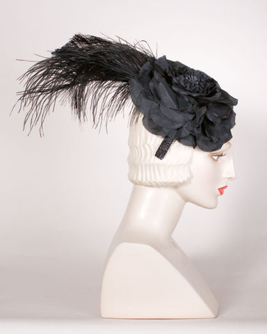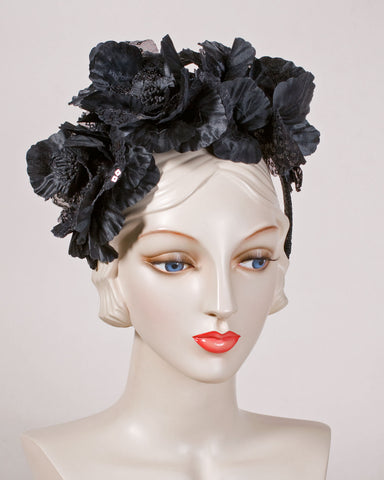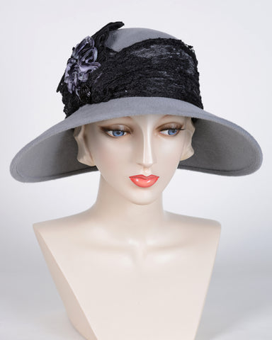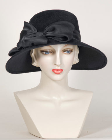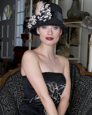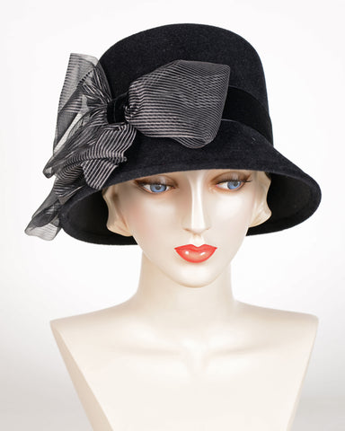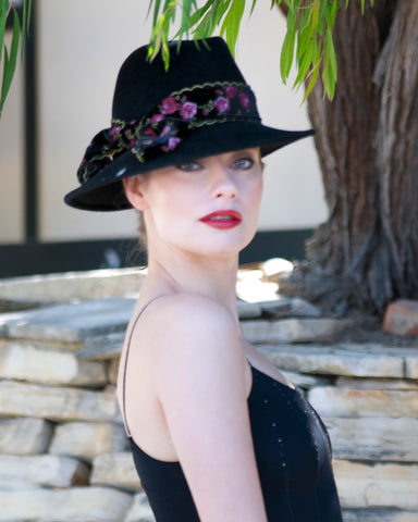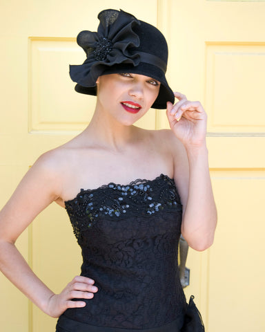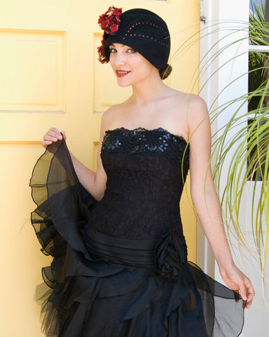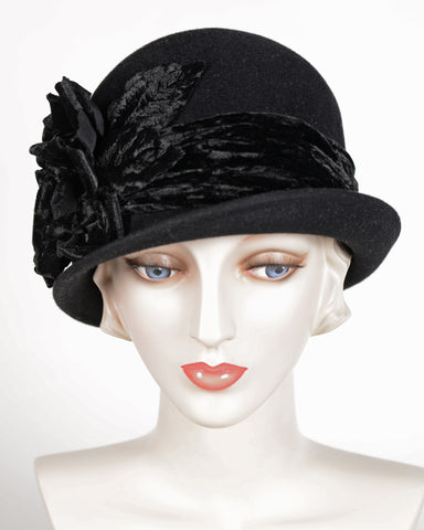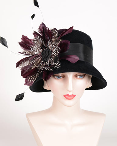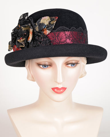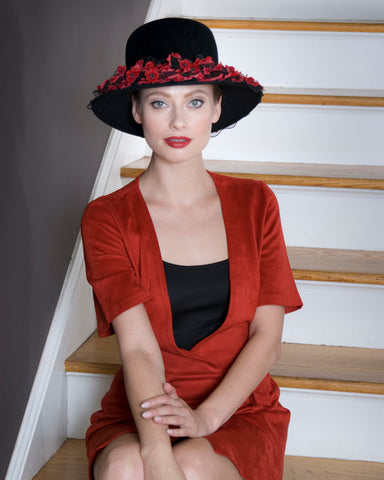 0421LUV Lucille, velour finished felt, black with scarlet & tea