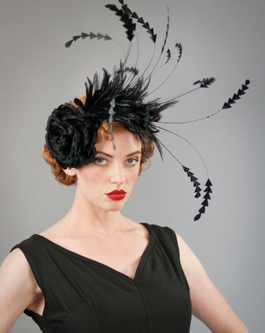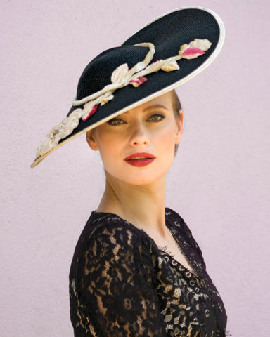 03871WY Whimsy, sinamay on Paglina braid base, black with scarlet & tea