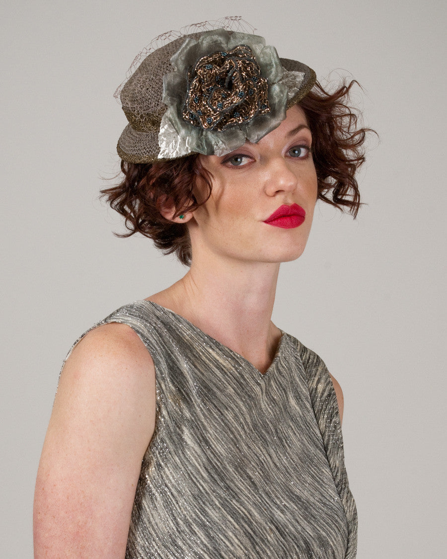 Doll Hat, taupe, toyo hat with beaded flower & veiling