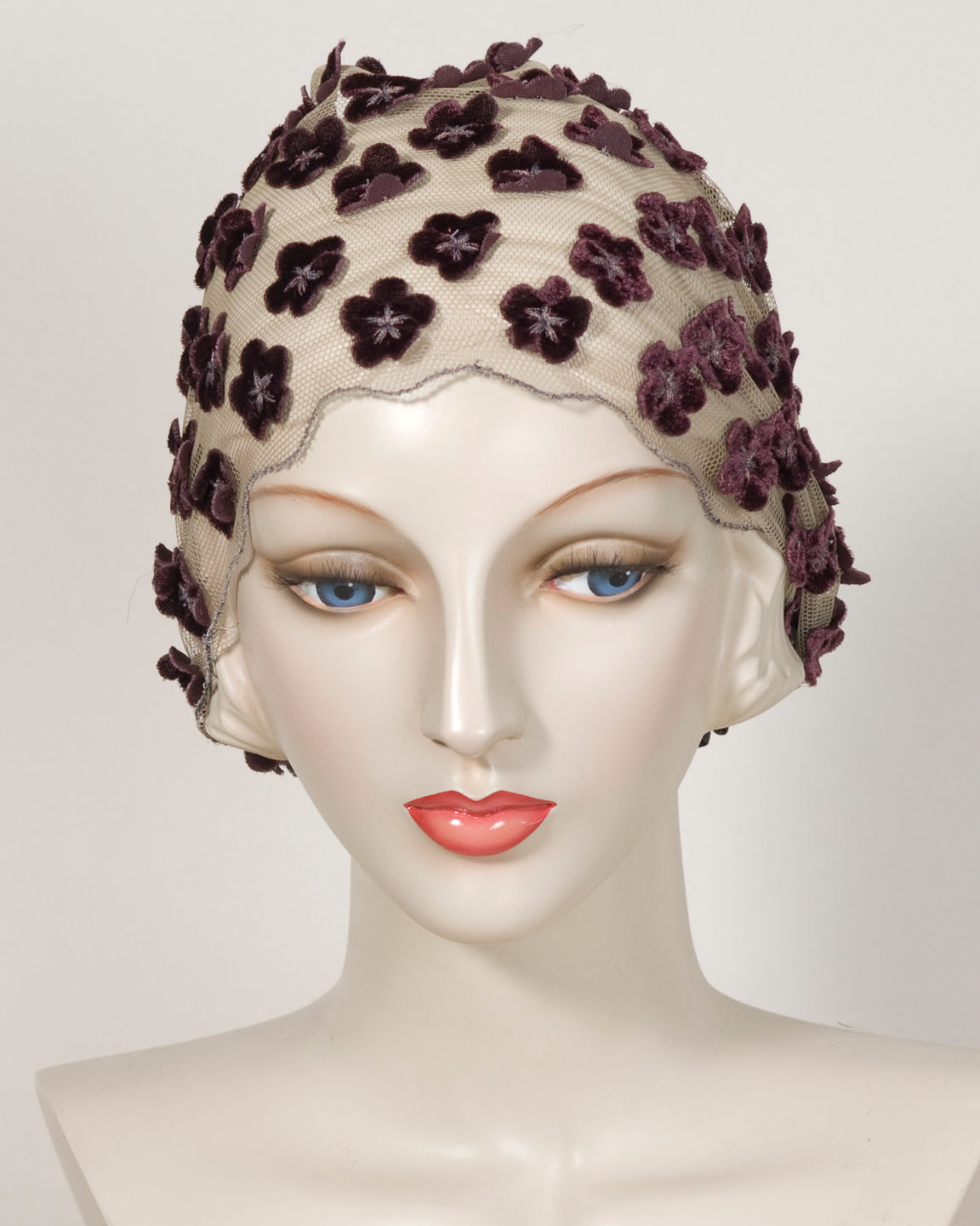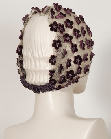 Profusion of tiny silk velvet flowers on tulle, silk covered elastic at back