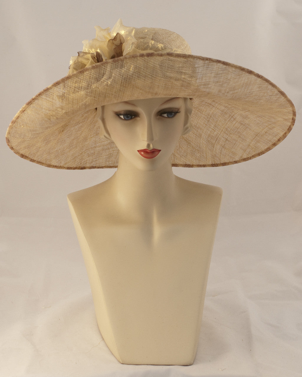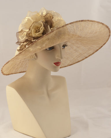 Sisal crown, sinamay brim with large metallic handmade cabbage rose