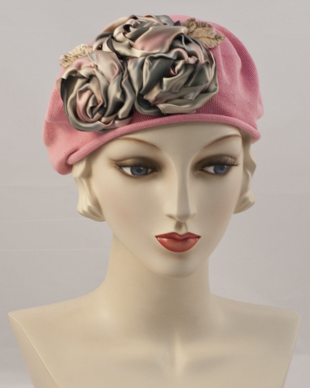 Cotton beret trimmed with 3 variegated silk ribbon roses & silk velvet leaves
